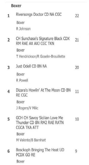 Congratulations to Tree Towns member Rick Johnson and his Boxer Doc on their #1 Obedience ranking (Rankings listed below).